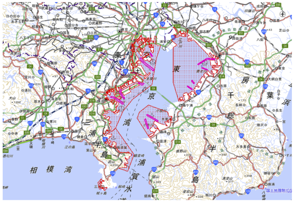 まず港則法が絡んでくるエリアは首都圏の場合は、以下の写真の赤の車線で囲われているところです。