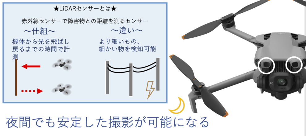 暗所や夜間でも高い安全性の中で飛行できるのは、安心できますね。