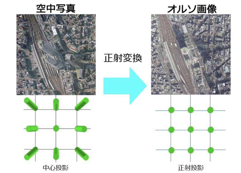 オルソ画像とは、この写真上の像の位置ズレをなくし、地図と同じように真上から見たような傾きのない、正しい大きさと位置に変換(正射変換)した画像のことです 。