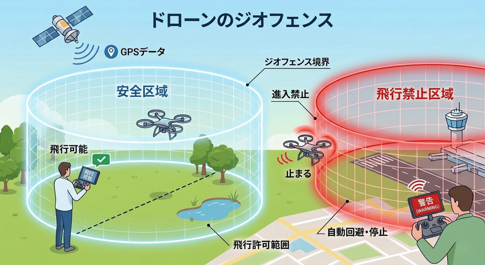 自動制御: 境界線に触れそうになるとシステムが介入し、見えない壁にぶつかったようにそれ以上の進行をブロックしたり、自動で離陸地点に戻る(Return to Home)動作をさせたりします。