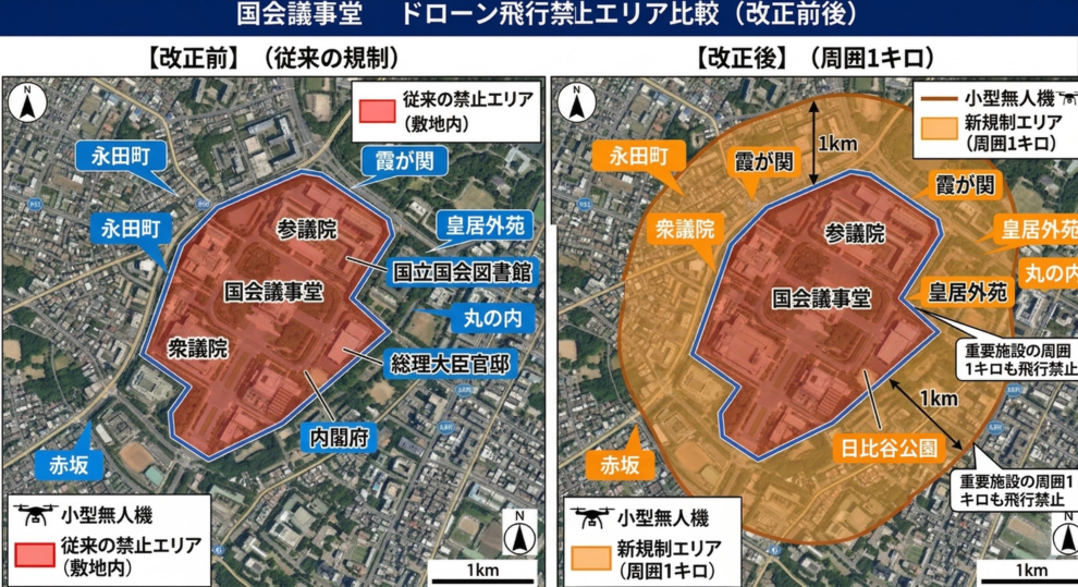 改正の最大のポイント:重要施設周囲「1キロ」が飛行禁止に