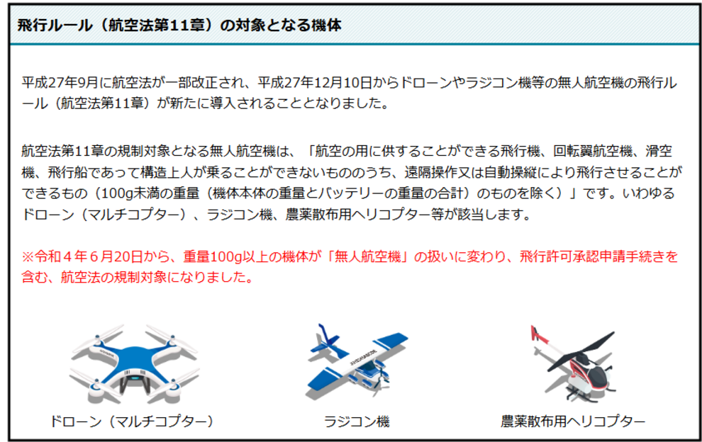以前は200g未満が規制対象外(模型航空機扱い)でしたが、2022年6月の航空法改正により、そのラインは「100g」に引き下げられました。