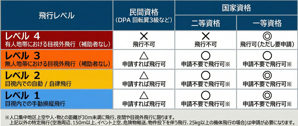 つまり、一等資格と二等資格の大きな違いは、レベル4飛行(有人地帯での目視外飛行)が「できる」か「できないか」が大きく異なります。