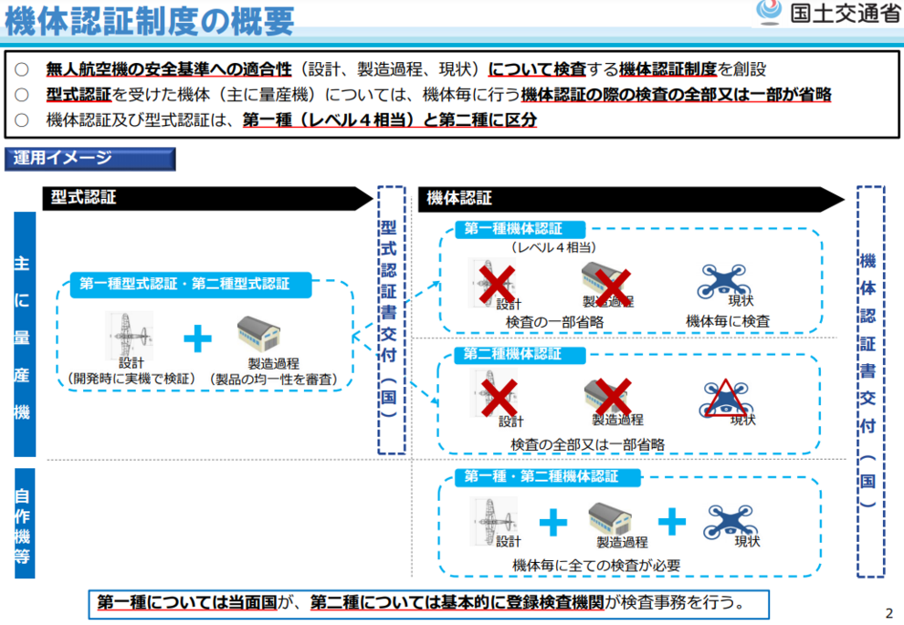 しかし、例えばDJI製品のような型式認証を受けた量産機は1機ずつ行う検査の一部または全部が免除される場合があります。