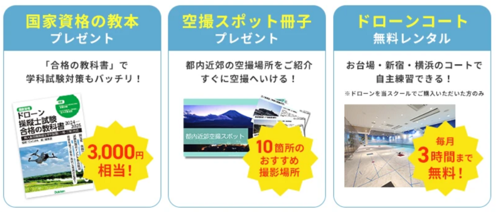 キャンペーン期間中にご入校いただいた方には、ドローンライフのスタートダッシュを決める豪華特典をプレゼント!