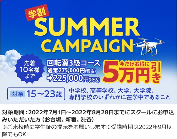 ・15歳以上(ドローン操縦士回転翼3級ライセンス発行が15歳以上のため)
